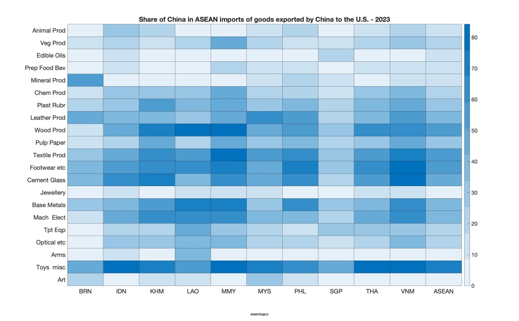 Surely some of the goods that were intended for sale in the U.S. may find their way to Indonesia, but Indonesia is unlikely to be amongst the top destinations. In 2023, goods that were exported by China to the U.S. (excluding those which are exempt from tariffs) were also exported to 207 other countries. Indonesia ranked 15th as a destination (using value of imports). Vietnam was in 4th place and Thailand in 11th. If the focus is limited to consumer goods (as defined by UNCTAD), Indonesia drops to 22nd place. As the following figure shows, China already has a large market share in many segments. How many more toys can Indonesian children buy?