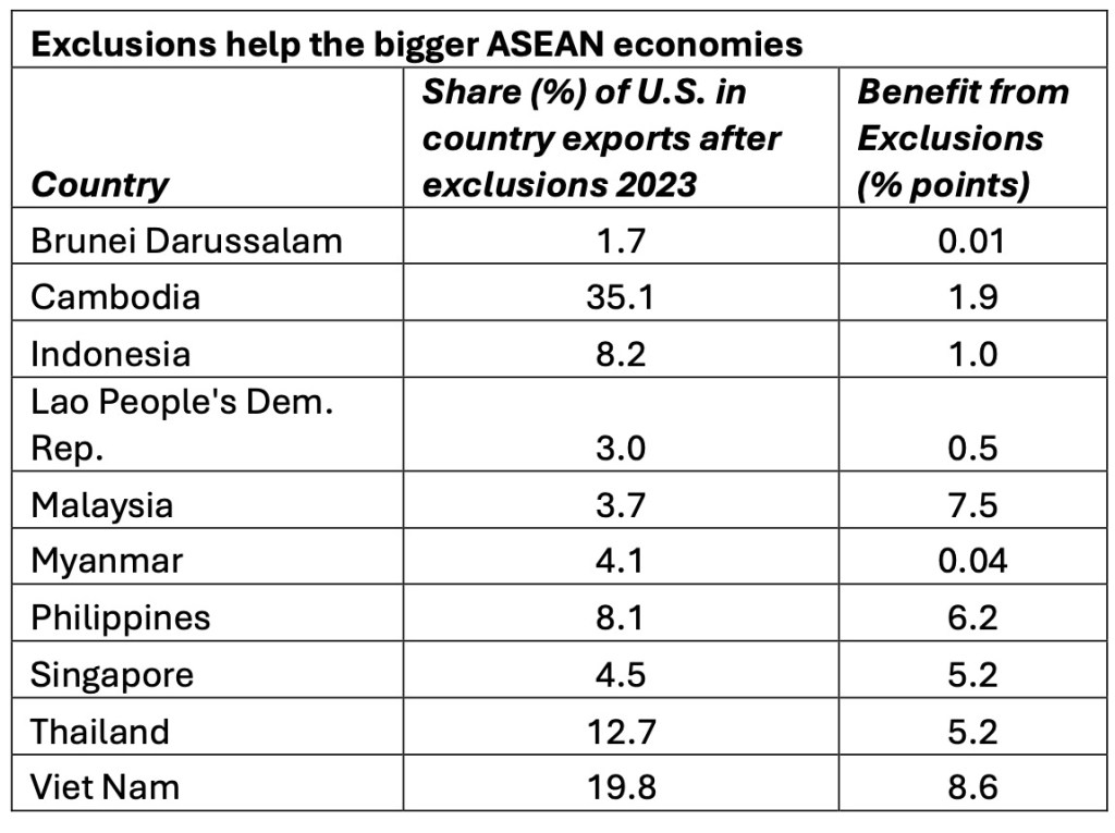 Smaller ASEAN countries such as Cambodia, Laos and Myanmar took a big hit as well. The ‘fake’ tariff calculation formula is a ratio, so its scale invariant. These countries primarily export garments, toys and leather goods. Countries have a 90-day reprieve, and some ASEAN countries have benefitted more than others from exclusions. The initial Executive Order (April 2nd) had some exclusions, and more were added in the April 8th amendment. As a result, a smaller share of ASEAN exports will be exposed to tariffs.
