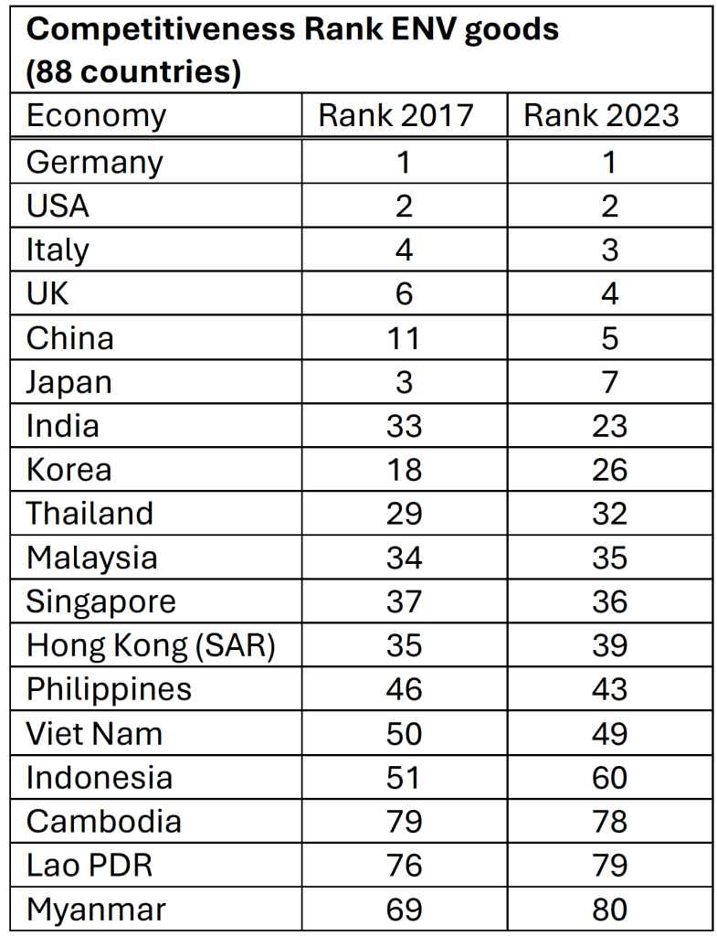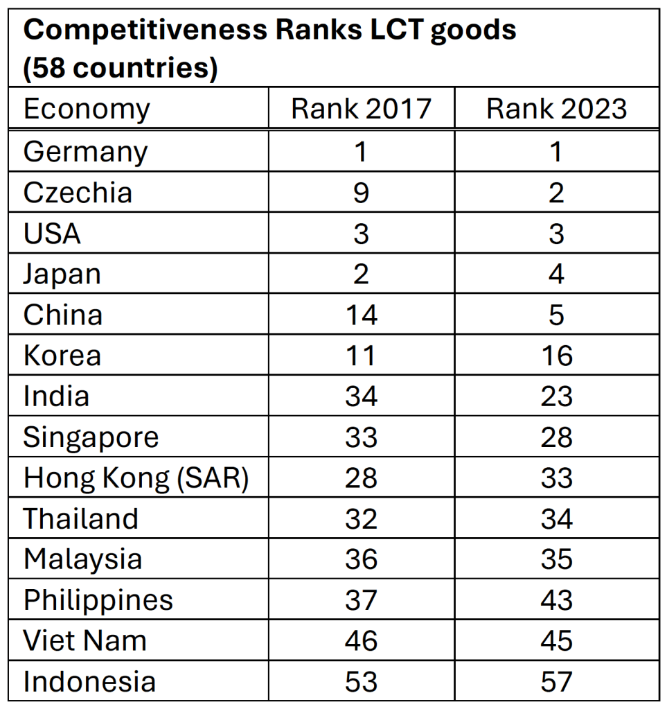 Between 2017 and 2023, China and India have improved their positions in both rankings, while Japan and South Korea have declined. Singapore has improved its position while Thailand has declined marginally. Malaysia has managed to roughly hold on, declining by one place in the ENV ranking but improving by one place in the LCT rankings. Vietnam shows a marginal improvement, but Indonesia has fallen behind. The Philippines shows an improvement in the ENV ranking but has fallen behind in the LCT ranking.