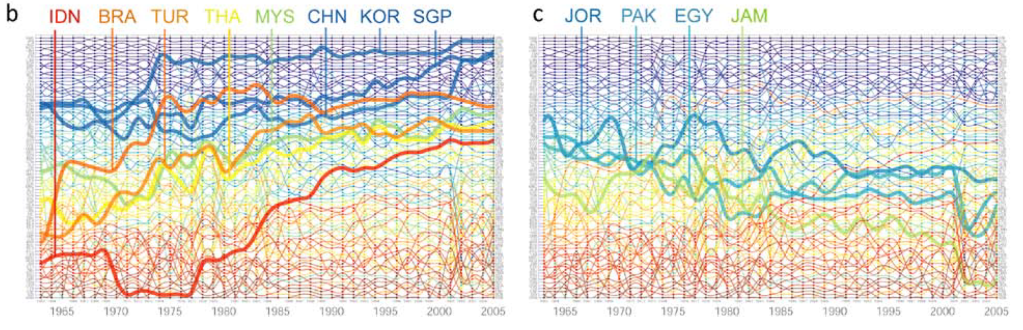 They have very little to say about how capabilities emerge; how they are accumulated and how (lower-ranked) countries can develop new capabilities. In fact, Hidalgo (2009) states that they are innate. He develops economic complexity rankings for a group of countries for a 42-year period (1963-2005) and identifies countries which moved up the rankings substantially. The “great transformers” included Singapore, China, Korea, Thailand, Malaysia, Indonesia and a few others (see below – reproduced from Hidalgo (2009), Figures 2b and c).