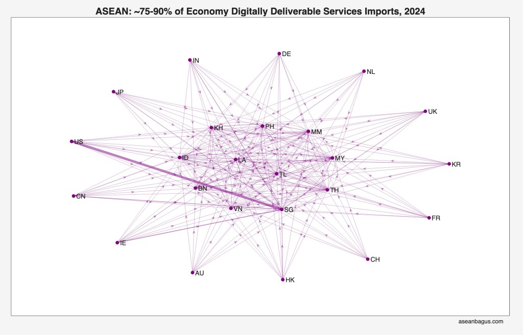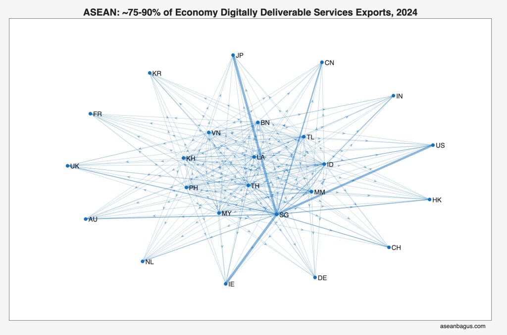 I provide here, some estimates (see methodology), of bilateral digitally delivered/deliverable services (DDS) trade for ASEAN. The following table shows the top-10 trading partners (based on total DDS trade). Of course, trade with Ireland is likely a conduit for more trade with American companies, many of which have affiliates there for tax and other reasons.