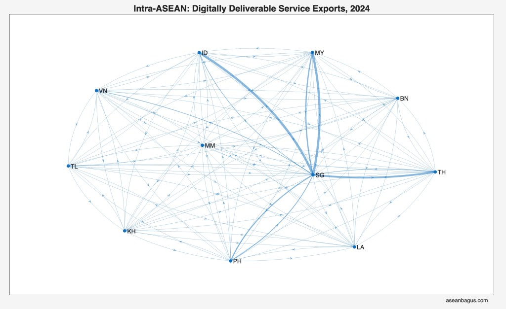 The following figure shows that most of DDS trade is between ASEAN-5. The smaller ASAEAN economies have a lot of catching-up to do (since BaTiS is a balanced database, imports mirror exports).
