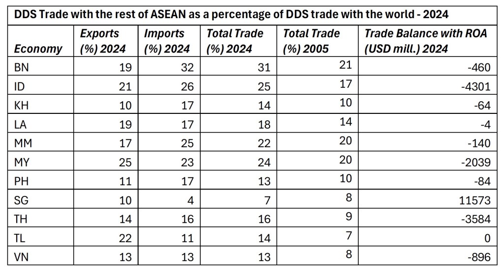 In 2024 ASEAN’s total DDS trade with the world was USD 546 billion and total Intra-ASEAN DDS trade was USD 60 billion (or roughly 11%). All other ASEAN countries are net importers as Singapore, which is a hub for DDS trade in ASEAN, is the only country with a positive trade balance with the rest of ASEAN. Singapore is also the least integrated with the rest of ASEAN. Comparing 2005 with 2024, (rest-of) ASEAN’s share in total DDS trade increased for all ASEAN countries except Singapore.