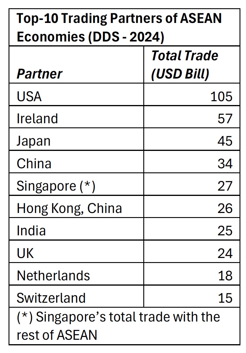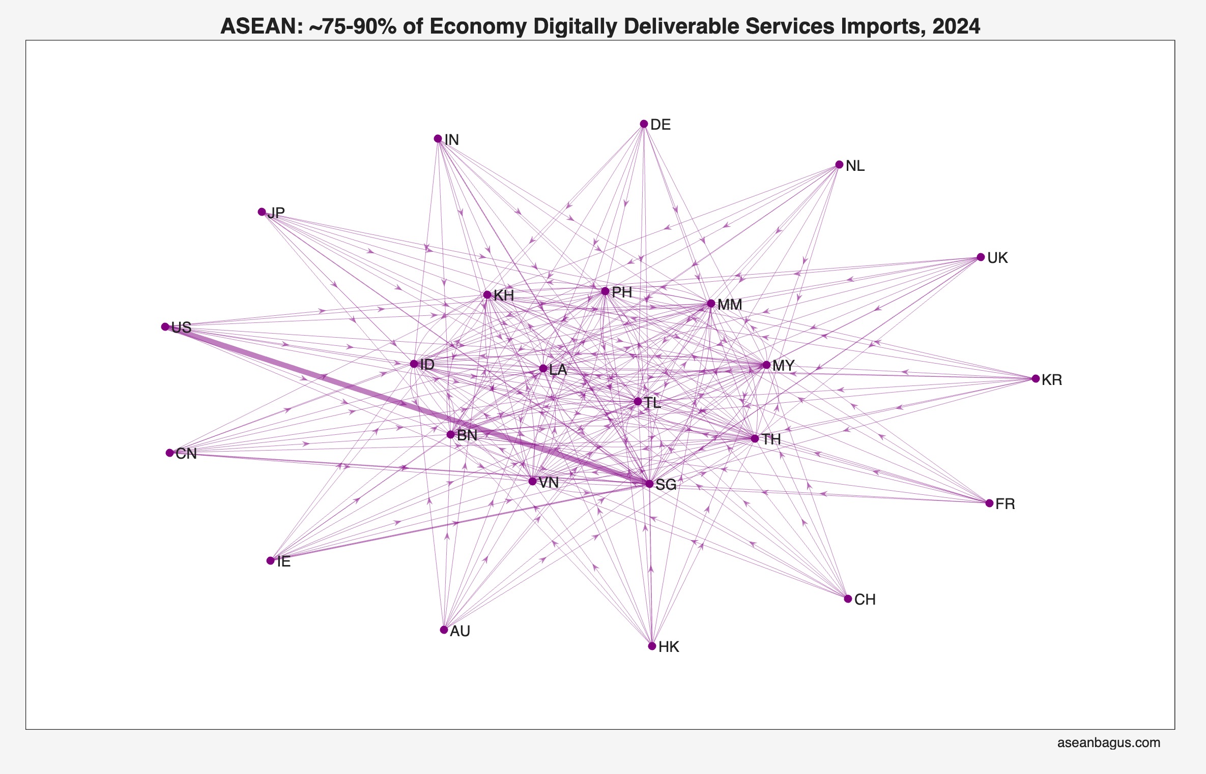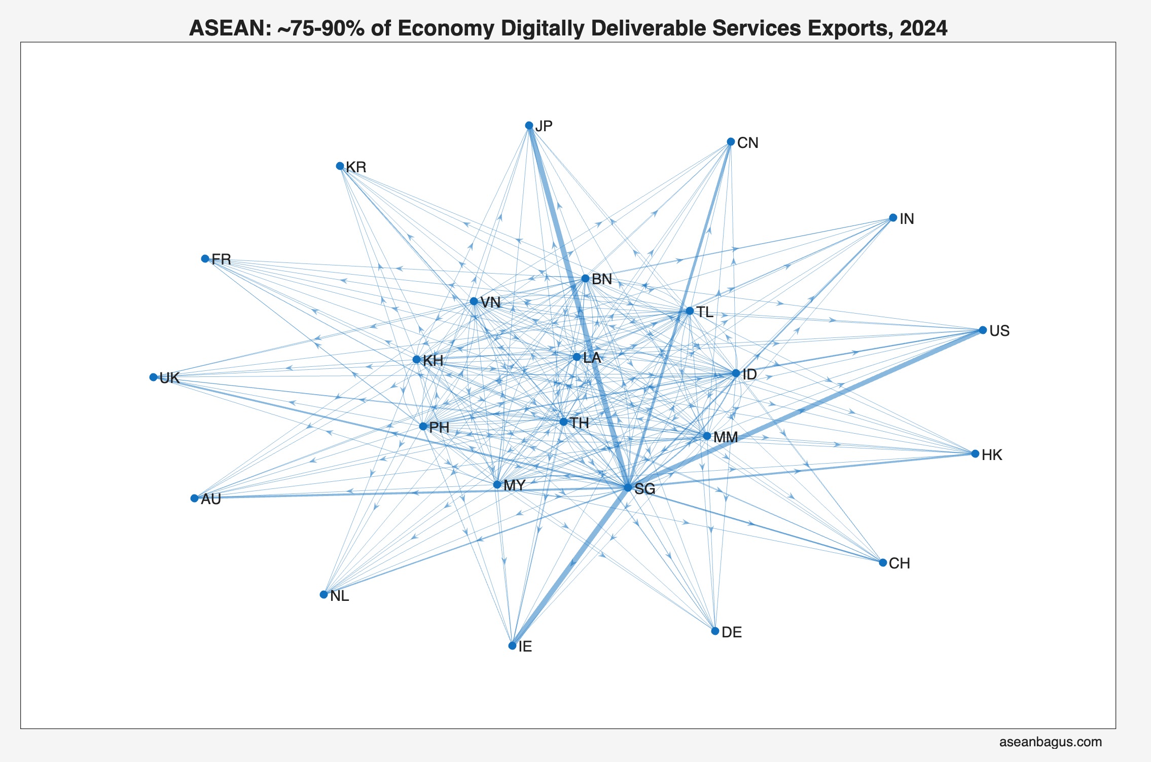 I provide here, some estimates (see methodology), of bilateral digitally delivered/deliverable services (DDS) trade for ASEAN. The following table shows the top-10 trading partners (based on total DDS trade). Of course, trade with Ireland is likely a conduit for more trade with American companies, many of which have affiliates there for tax and other reasons.