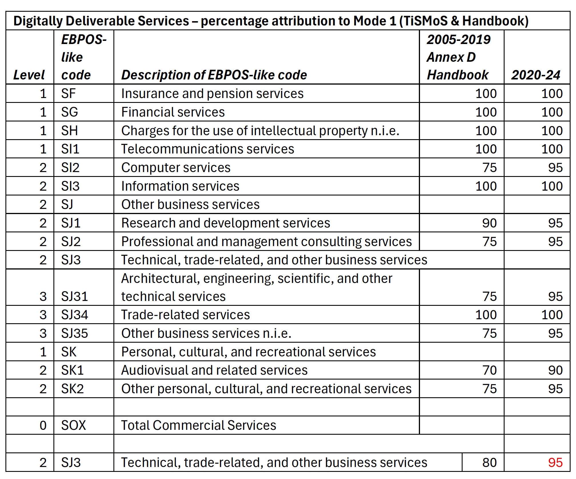 Finally, although BaTiS, is a ‘constructed’ bilateral trade in services database, it is the only one that provides a balanced panel from 2005 to 2024 for about 200 economies. All other databases, TiSMoS, DDS and the WTO services trade databases provide unbalanced panels as they have missing observations for many economies. Anything related to DDS is best treated as an estimate. There are no definitive numbers. More importantly, my major concern with the attributions to Mode 1 in the Handbook is that the same set of proportions apply to all countries regardless of level of economic development – so there is no ‘digital divide’. All the more reason for them to publicly issue a methodology update.