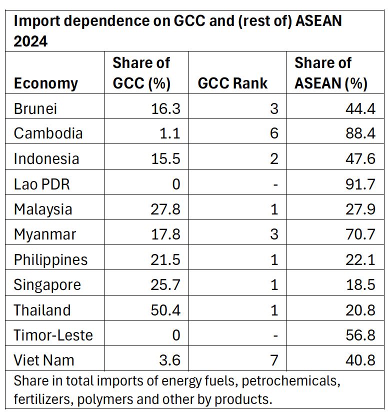 The table below shows the import dependence of ASEAN economies on 10 GCC economies. It also shows intra-ASEAN imports. The top-10 import sources account for between 82 to 99% of imports of individual ASEAN economies. Three GCC countries are most important and frequently appear in the top-10 import sources of individual ASEAN economies: Saudi Arabia (8 times), United Arab Emirates (8 times) and Qatar (4 times). Oman is an important source for Cambodia and Myanmar.