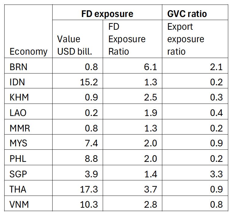 ASEAN economies are export-oriented, so the ‘exposure’ to GCC is ‘passed through’ to other economies via two channels: exports of intermediate goods and exports of final goods. The GVC ratio (export exposure ratio) shows this pass-through. It is the ratio of exposed exports to exposed final demand. Exposed Singaporean final demand is USD 3.9 billion, so exposed exports are 3.3 as much or roughly USD 13 billion.
