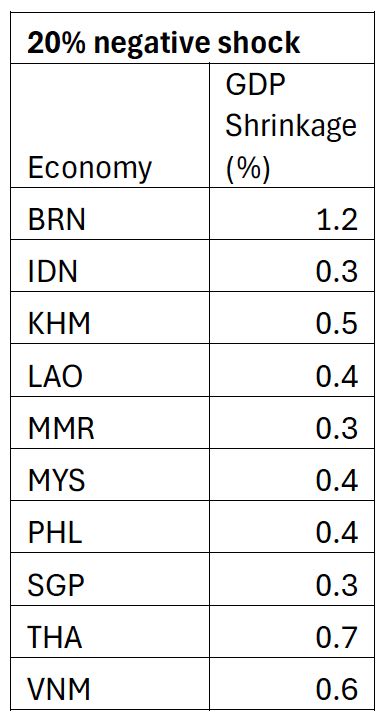 Lastly, I estimate the GDP contraction (or shrinkage) in ASEAN economies due to a 20% reduction in the value of inputs supplied by the GCC’s crude oil & gas, refined petroleum products and chemicals industries. The results are provided below.