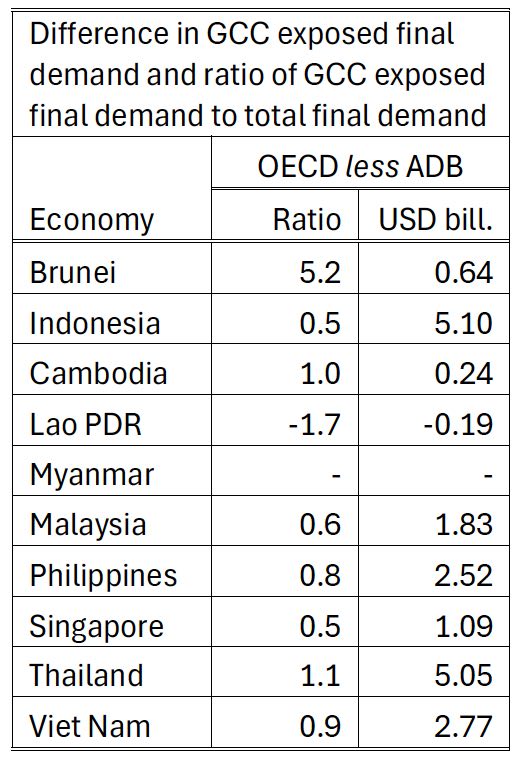 The ADB also has publicly available MRIO (multi-regional input output) tables for the year 2024. I use these only to show that the differences in final demand exposed to the GCC can be quite substantial. The OECD tables use a top-down or macro consistency approach where are the ADB tables used a bottom-up approach (starting from individual country supply-use tables). There are other differences as well. The ADB reports exports and imports on a fob and cif basis respectively. Although the ADB tables are likely more representative of ASEAN and more recent (2024), they have fewer sectors/industries and they are missing Myanmar.