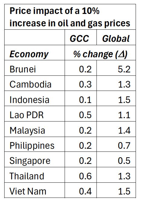 Why are these rough estimates? Because the ADB tables have two limitations. First, they have 62 countries and the rest of the world (ROW). None of the GCC countries are included in the 62 countries, although other sources of oil and gas such as Australia, Russia, USA, and Kazakhstan are included. Latin American, African, GCC countries and others are all aggregated as ROW (rest of the world). In the GCC price shock, I use ROW, which is an overestimate since it also includes African producers such as Nigeria and Angola, which export to some ASEAN economies, although these are not major sources.