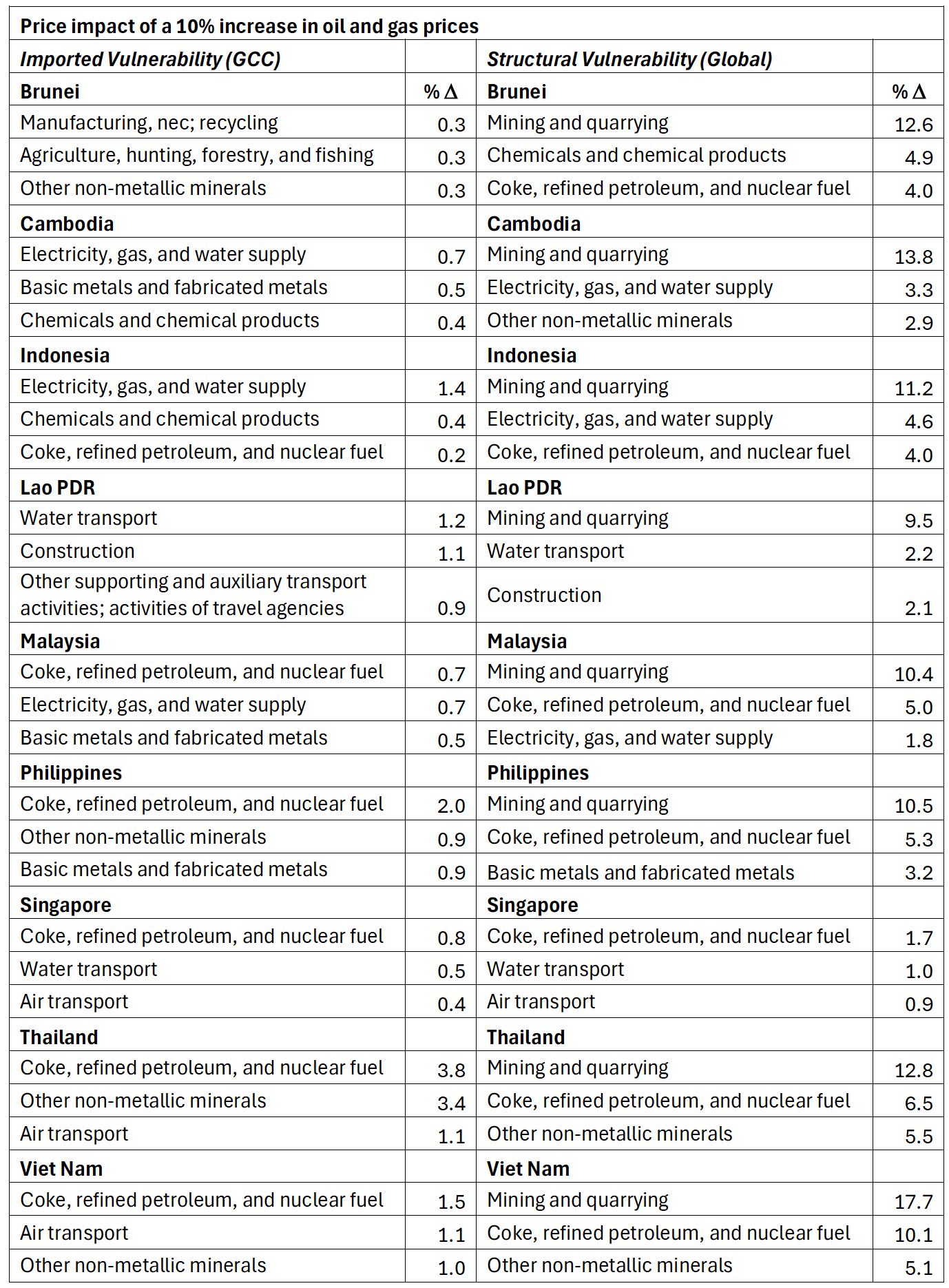 I provide rough estimates of the inflationary impact on ASEAN economies and also list the industries whose output prices are impacted the most (top 3). The limitations of the estimates are described in the notes and are due to the limitations of the ADB-MRIO (multi-regional input-output) tables. I use these because both constant and current price tables are available for the year 2024 (most recent available).